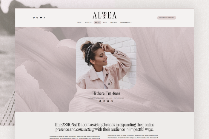 Altea is a feminine WordPress and Elementor template that radiates a contemporary, inviting charm in delightful shades of pink, imbued with a playful, joyful, and imaginative spirit. Its elegant yet remarkably versatile design invites extensive customization, rendering it perfect for any business venture. Crafted with Elementor, it offers a seamless and straightforward customization experience.