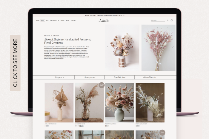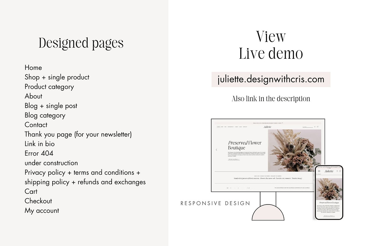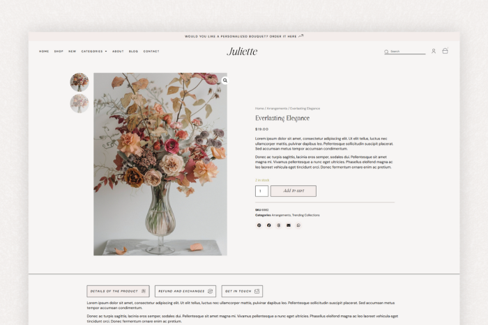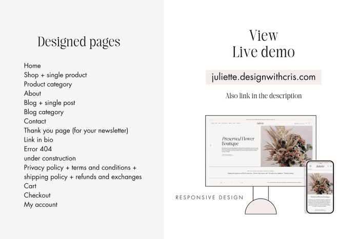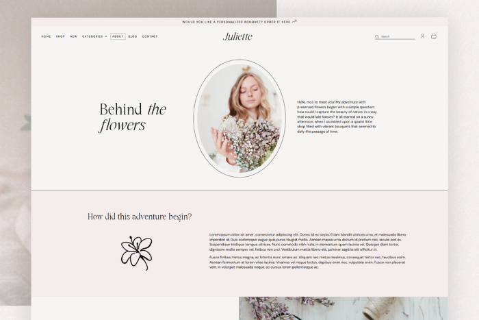 Welcome to our chic, minimalist WordPress and WooCommerce template! Isn’t it perfect for showcasing your products in a way that’s both feminine and modern? The design is sleek and clean, adaptable and versatile. I’ve designed it to be the perfect canvas for your products!