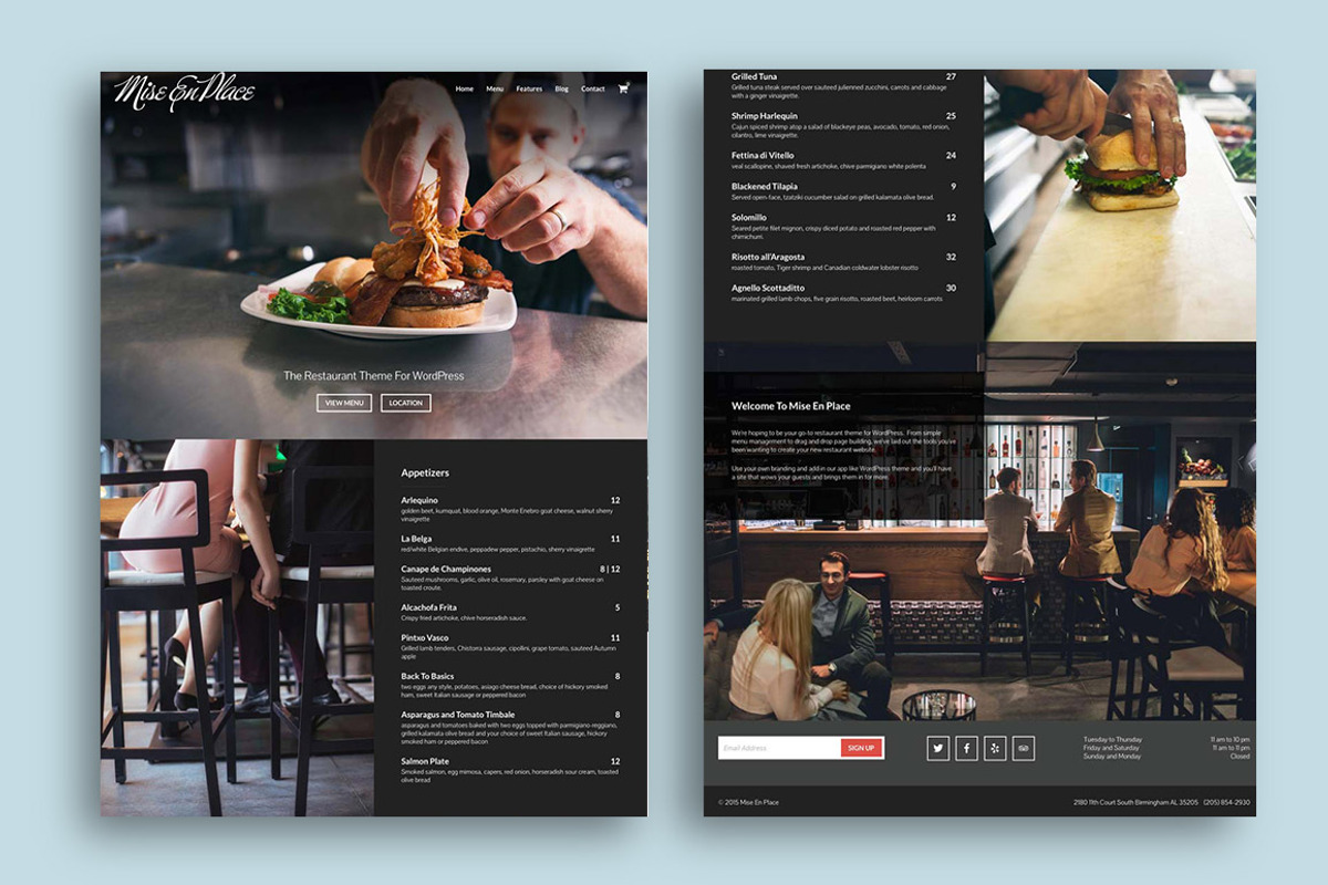 In French, Mise En Place means “put in place” and carries the idea that a chef has everything they need in place before the cooking ever begins. Our Mise En Place WordPress theme is designed with that same philosophy, giving you the tools you need to create an amazing site for your restaurant.