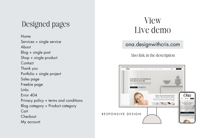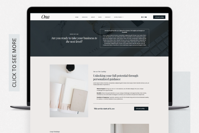 Introducing Ona, a feminine WordPress theme, known for her simplicity and elegance. Perfect for all you coaches, consultants, and service providers out there looking for a sleek and simple web presence. But don’t think for a second that simplicity means sacrificing style! Ona’s design is attentive and stylish, ready to adapt to your unique project. And the cherry on top? Ona is designed with Elementor, making customization a breeze. So, are you ready to add your personal touch and enjoy the journey of creating your website? Let’s dive in!